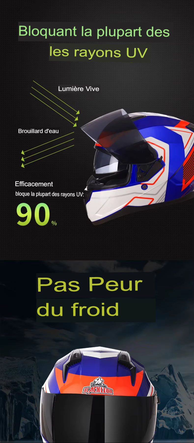 Double visière intégrée – Visière extérieure transparente + pare-soleil intérieur pour un confort visuel toute la journée