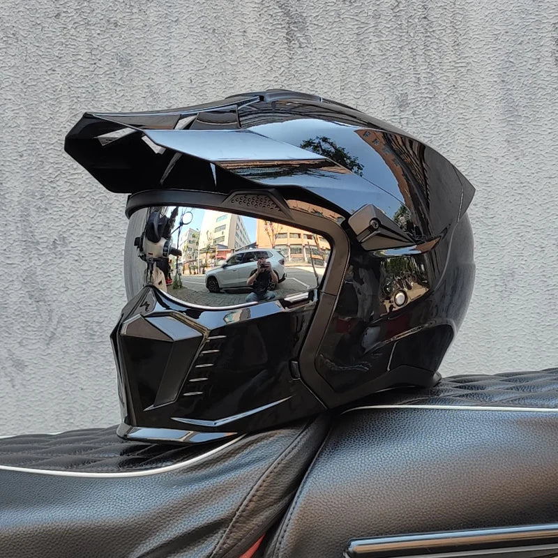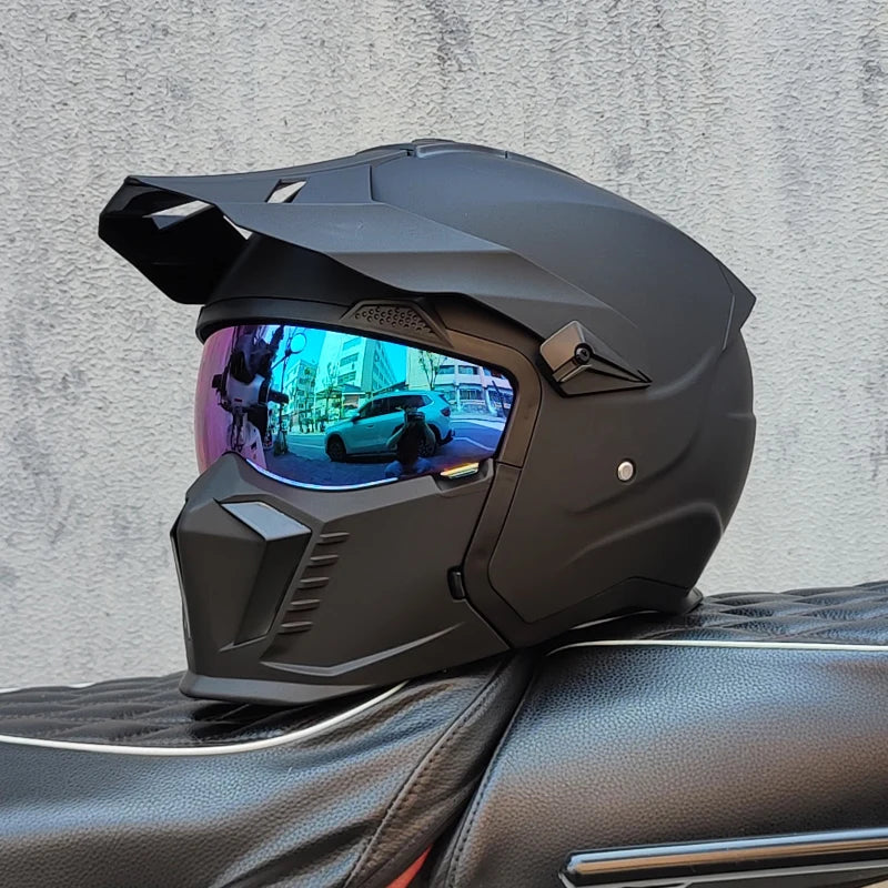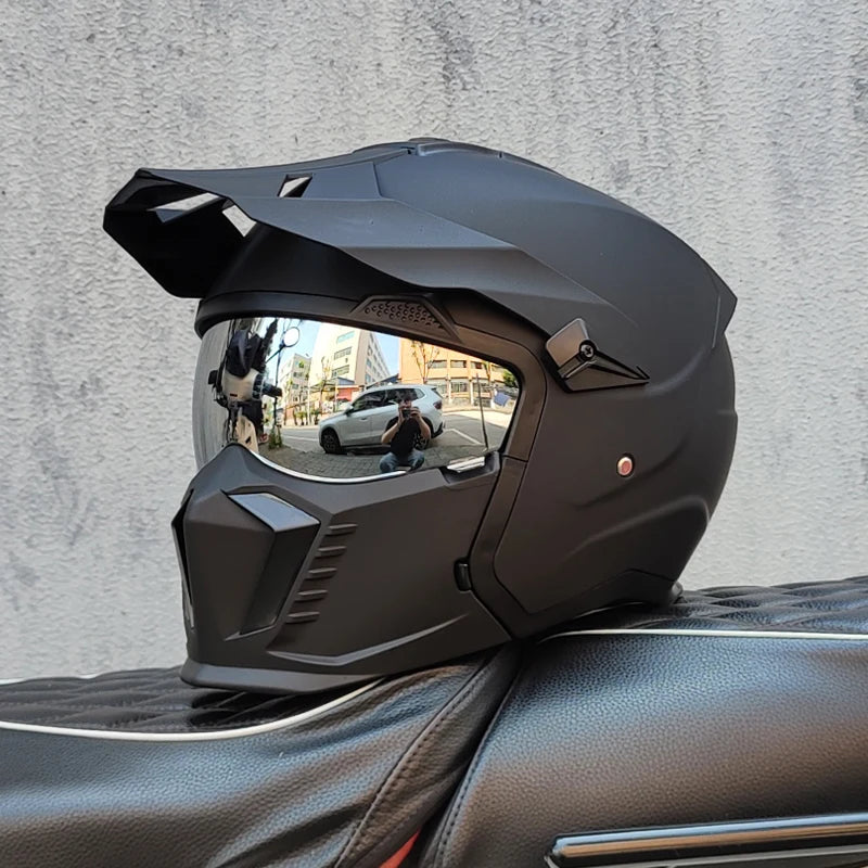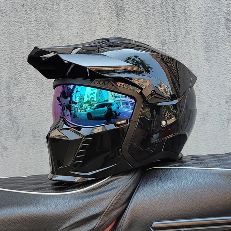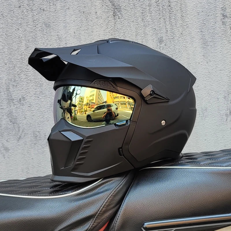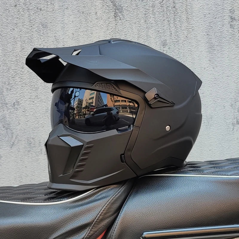 Casque moto intégral au design sportif et rétro, certifié ECE & DOT pour une sécurité optimale. Équipé d’une double visière (transparente et solaire), d’un système de ventilation avancé, d’une coque résistante aux chocs et d’un intérieur amovible et lavable. Visière détachable pour un look Street Fighter unique. Idéal pour moto, scooter ou motocross, alliant style, confort et protection.