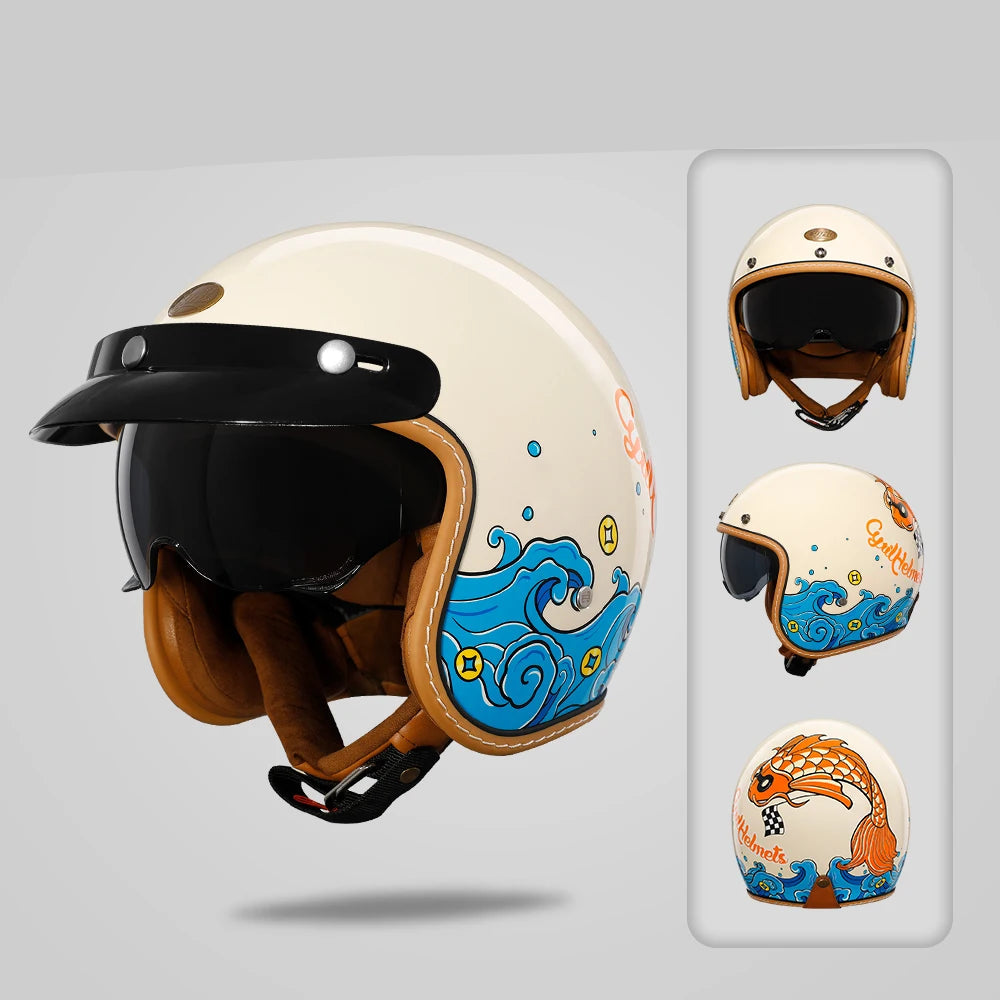 Casque moto vintage demi-visage B206 – Casque ouvert 3/4 au style rétro élégant, certifié DOT & ECE pour une sécurité maximale. Conçu en ABS léger et résistant avec intérieur confortable et finition cuir haut de gamme. Unisexe, idéal pour homme et femme, parfait pour un look classique en moto ou scooter.
